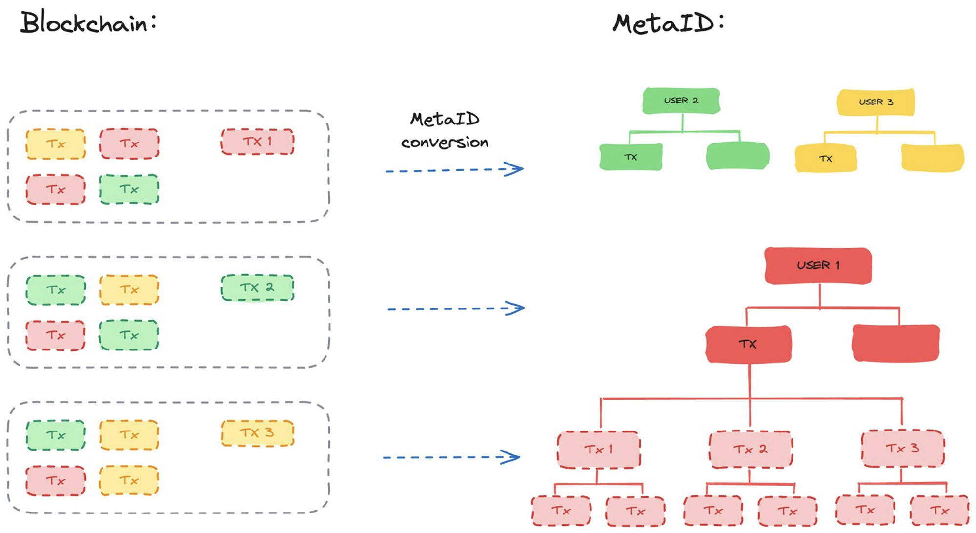 The biggest difference between MetaID and other protocols is that MetaID organizes scattered on-chain data into tree-like structures, using ‘people' as the classification method. Data from other protocols is like scattered stones and bricks, while MetaID data is like piles of structured building materials classified by ‘people’, making it easy for us to build skyscrapers.
