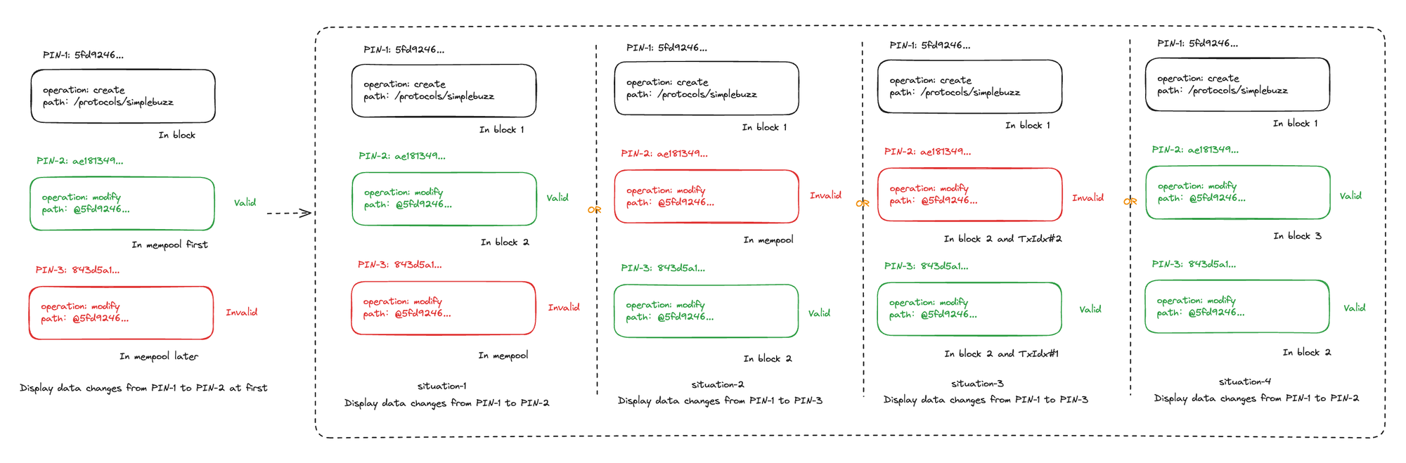 4. 當`operation`為`modify`/`revoke`時，`path`需要指向對應的PIN，例如：`@{pinid}`。所指向的PIN必須是用戶已在鏈上存在並打包出塊的PIN的`path`，才是有效的`modify`/`revoke`，所針對的PIN必須在不同的塊高。