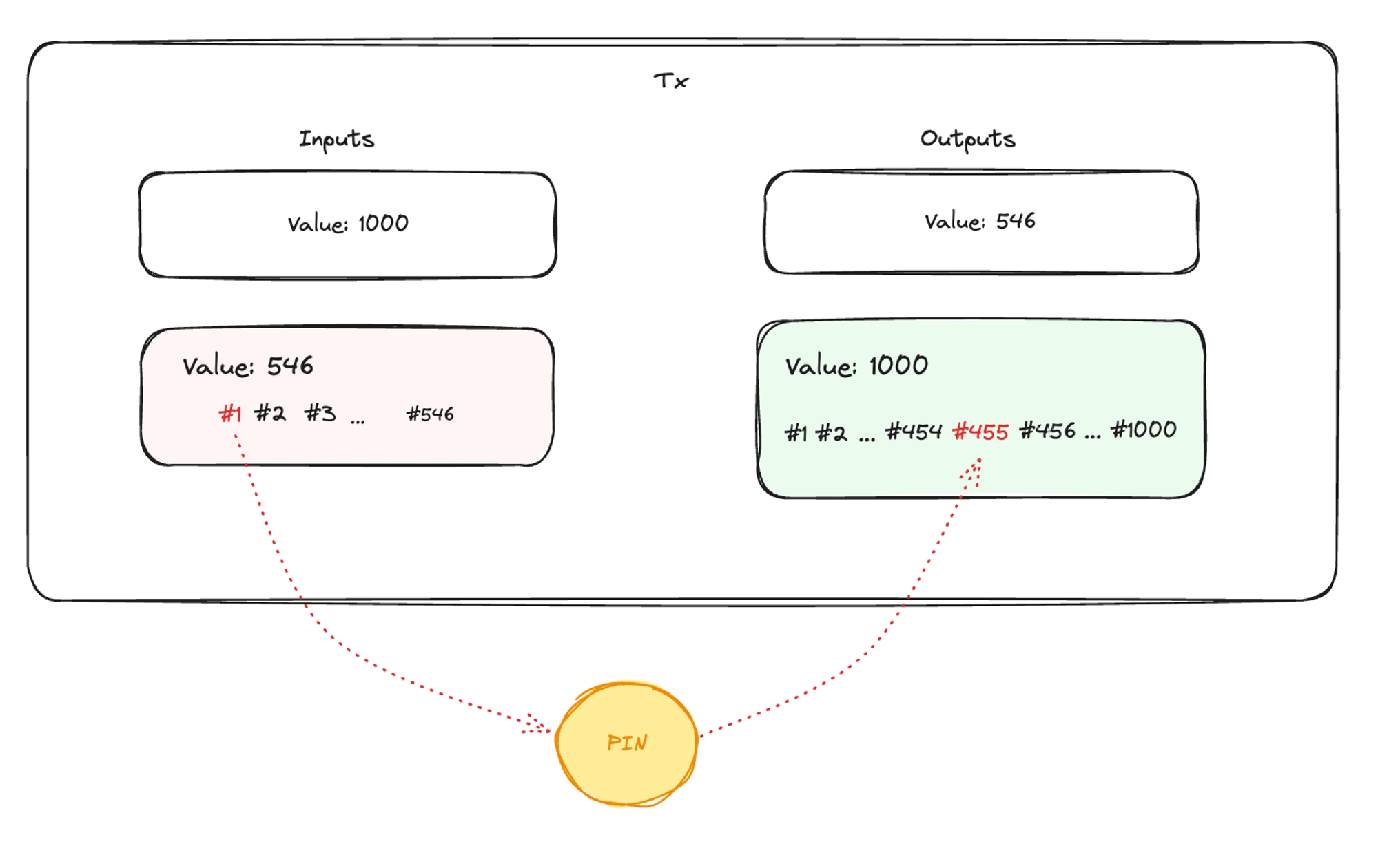 PIN 採用序數理論,PIN 內容負載在交易的輸出中,默認在其輸出的第一個 Satoshi 上。當 PIN 被創建時,該交易輸出的第一個 Satoshi 即代表該 PIN。